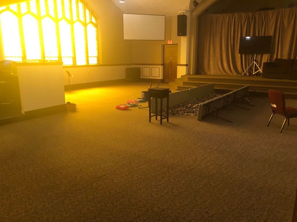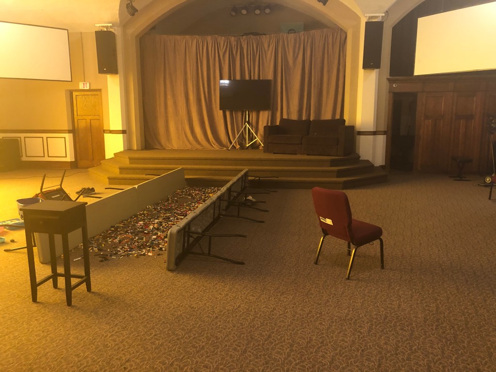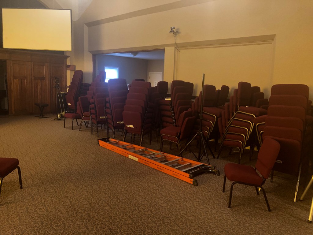 The Church chairs stacked and empty for weeks on end and preparation for the live streamed youth group began.